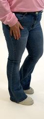 Deze blauwe flarden jeans heeft een aansluitende pasvorm voor onze plussize dames en biedt een comfortabele fit. Heuphoogte: normaal